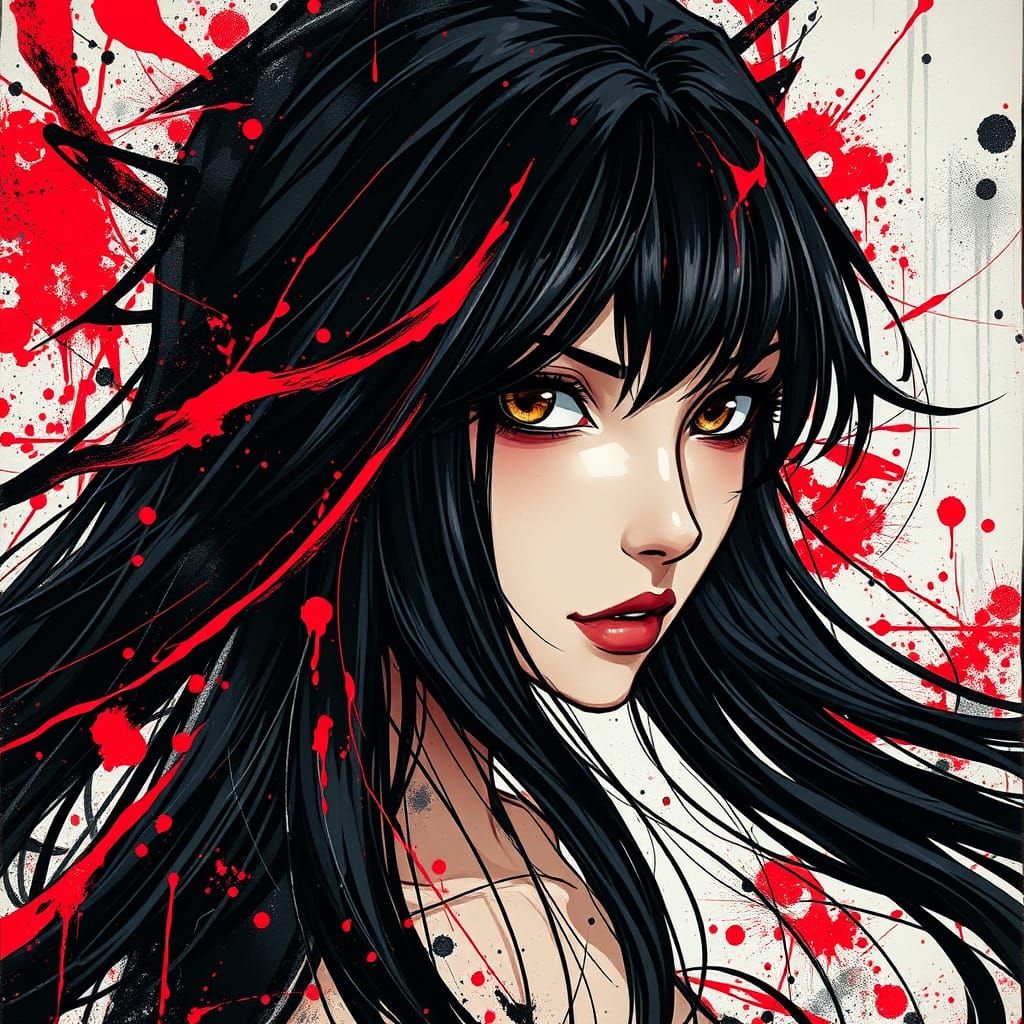 This image depicts a striking anime female with flowing black hair and intense brown eyes, set against a backdrop of vibrant graffiti art with bold, high-contrast colors and intricate details.