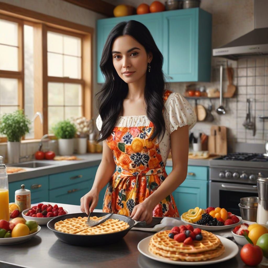 This image shows a young woman with long black hair preparing waffles in a colorful kitchen. The scene features stainless steel utensils and a vibrant, detailed atmosphere in a hyperrealistic style.