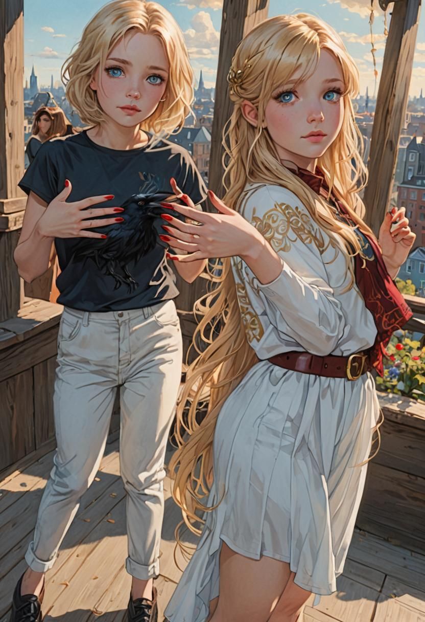 This image shows two anime-style girls facing each other. One has black hair and brown eyes, and the other has blonde hair, blue eyes, and red nail polish. The image is brightly colored with dynamic lighting.
