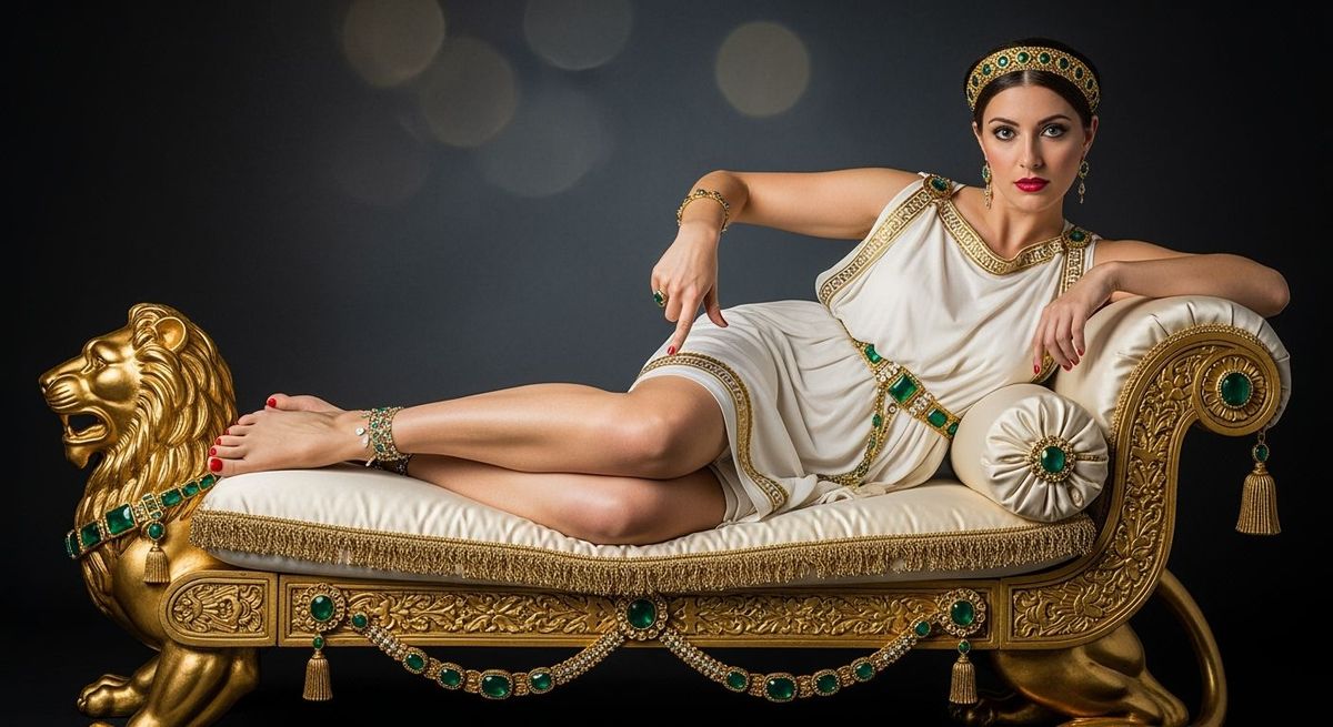 A vivid portrait of a Roman Empress reclining on a golden, lion-shaped chaise lounge. Shot with a DSLR, the image features sharp focus, studio lighting and a shallow depth of field.
