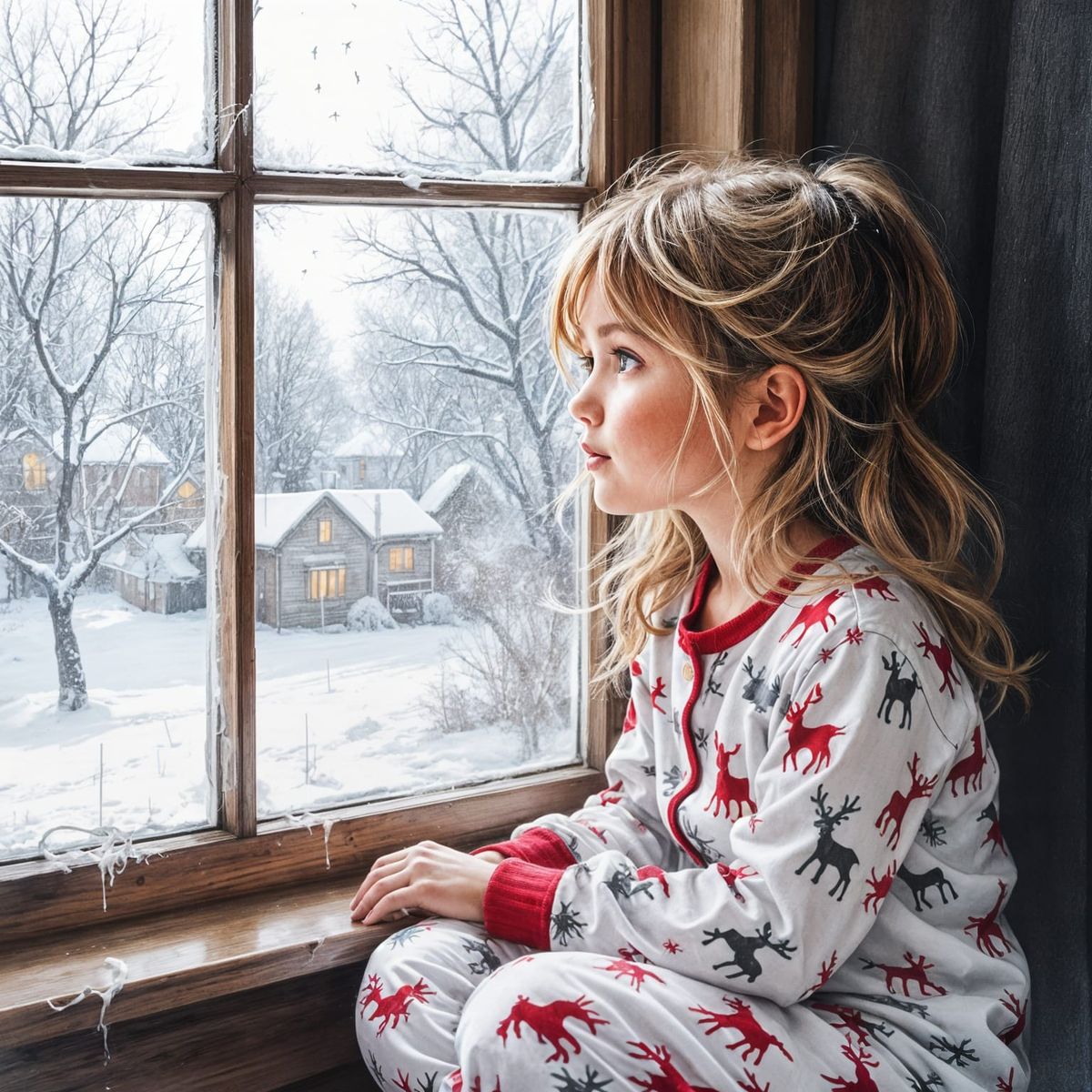 This pencil drawing shows a young girl wearing reindeer Christmas pajamas, gazing out a window on a wet, dreary day.