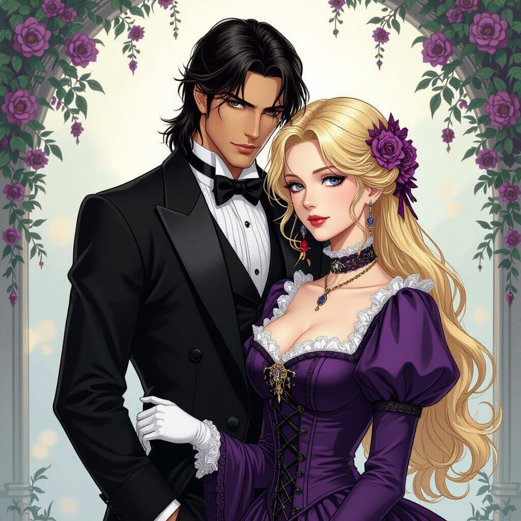 This image shows a Native American vampire in a tuxedo standing behind a blonde woman in a Victorian dress. The stylized anime scene features dramatic lighting and intricate details.