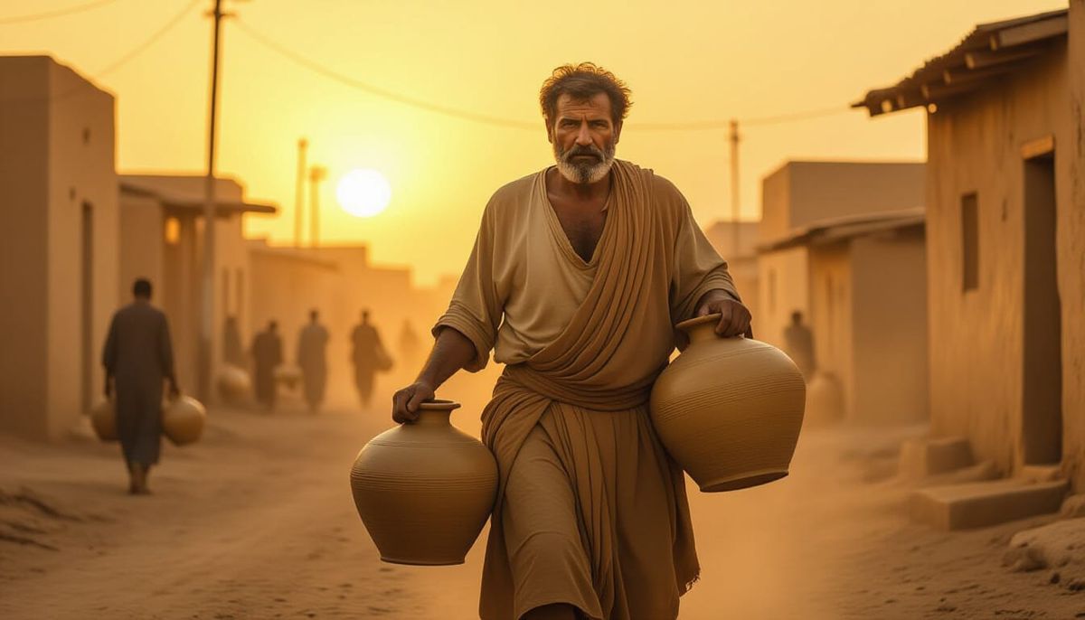 This image shows a dignified labourer carrying water jars at sunset in a dusty village. Rendered in a painterly style with earthy tones and cinematic lighting, it evokes resilience and humility.