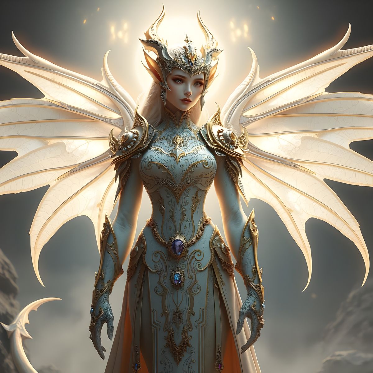 This image depicts a stunning, ethereal female dragonkin, showcasing opalescent white wings and resplendent white and gold plate armor adorned with intricate filigree, etchings, and gemstone accents, set against a deep, fantasy world backdrop.