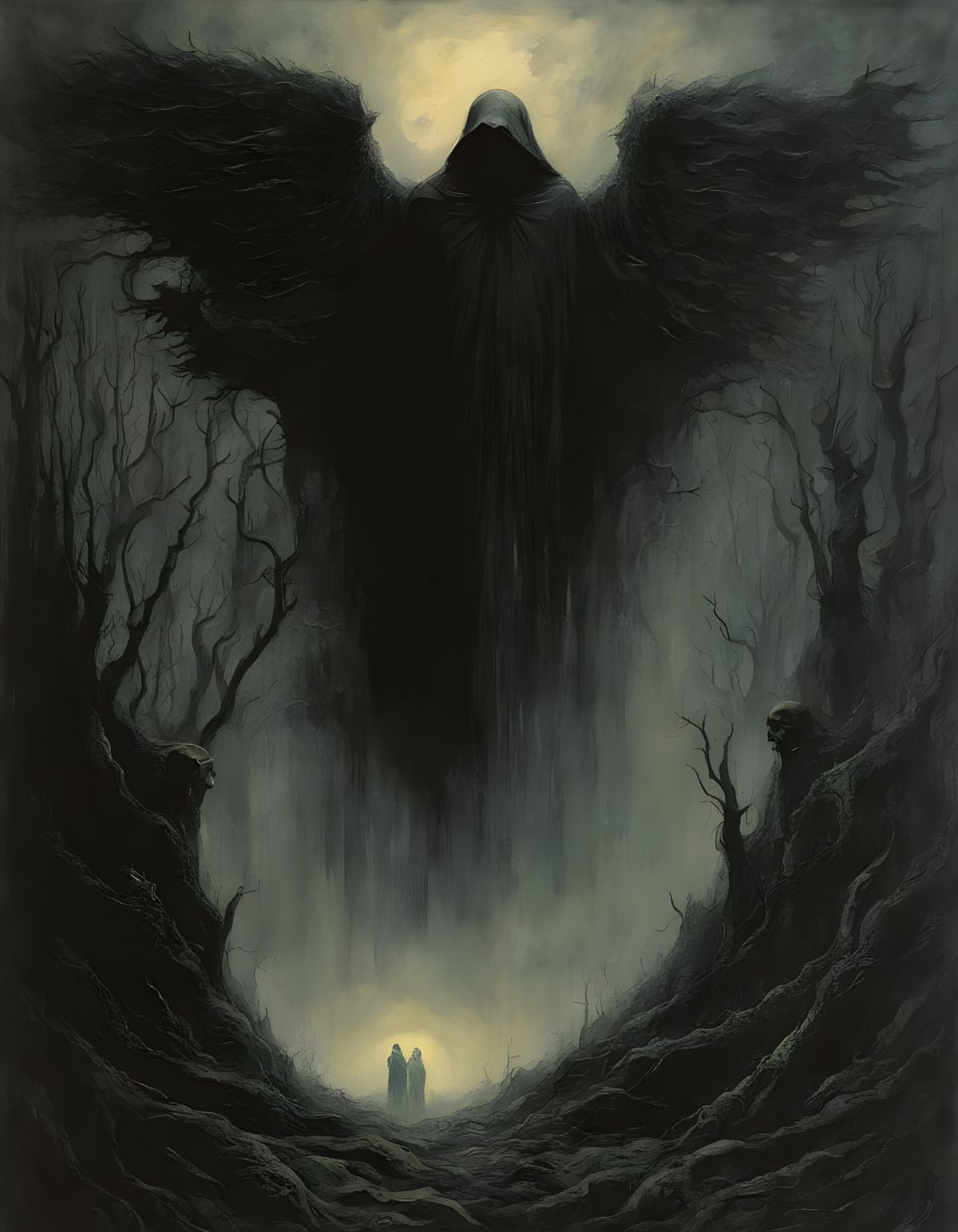 A haunting digital painting of a tall, imposing figure in dark, flowing robes, with spread wings and a sword, set against a misty background with strong backlighting, evoking a sense of mystery and power.