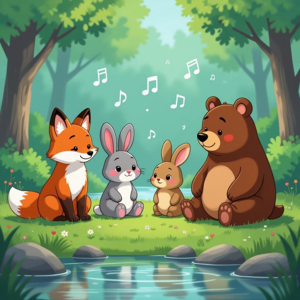 This image shows a fox, bunny, owl, and bear sitting by a stream. Gentle lines and musical notes create a tranquil cartoon aesthetic with soft textures and colors.