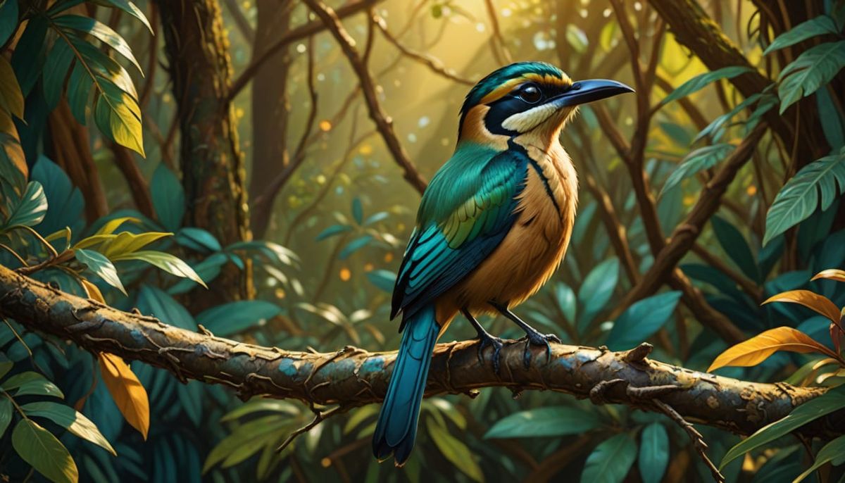 A striking picture of an Andean motmot perched on a branch in a rainforest. The bird's iridescent feathers glisten in the warm light of this vibrant oil painting.
