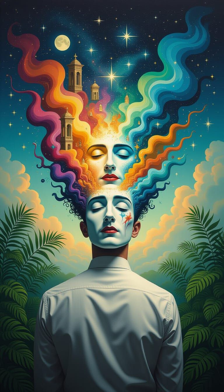 A surreal image of a man's head exploding with thoughts and colors. Metaphorical objects and symbols of life swirl amidst lush plants, stars, and stardust in a dark fantasy style.