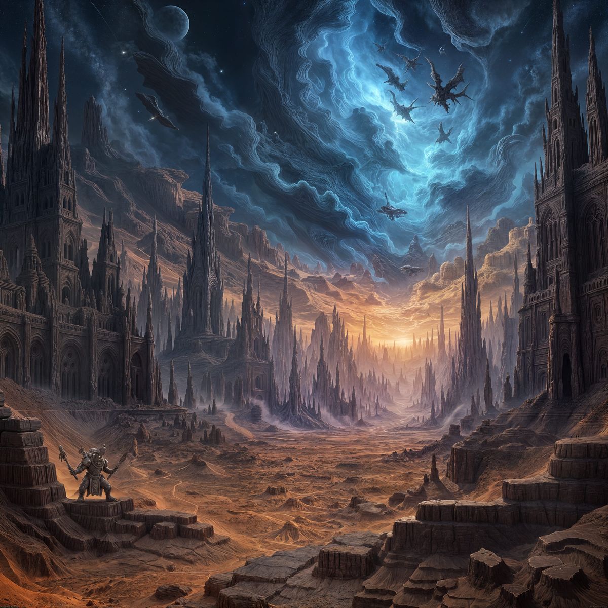 This photorealistic image depicts an alien desert with giant geological formations under a sky of swirling nebulae, showcasing subtle light and shadow on the terrain.