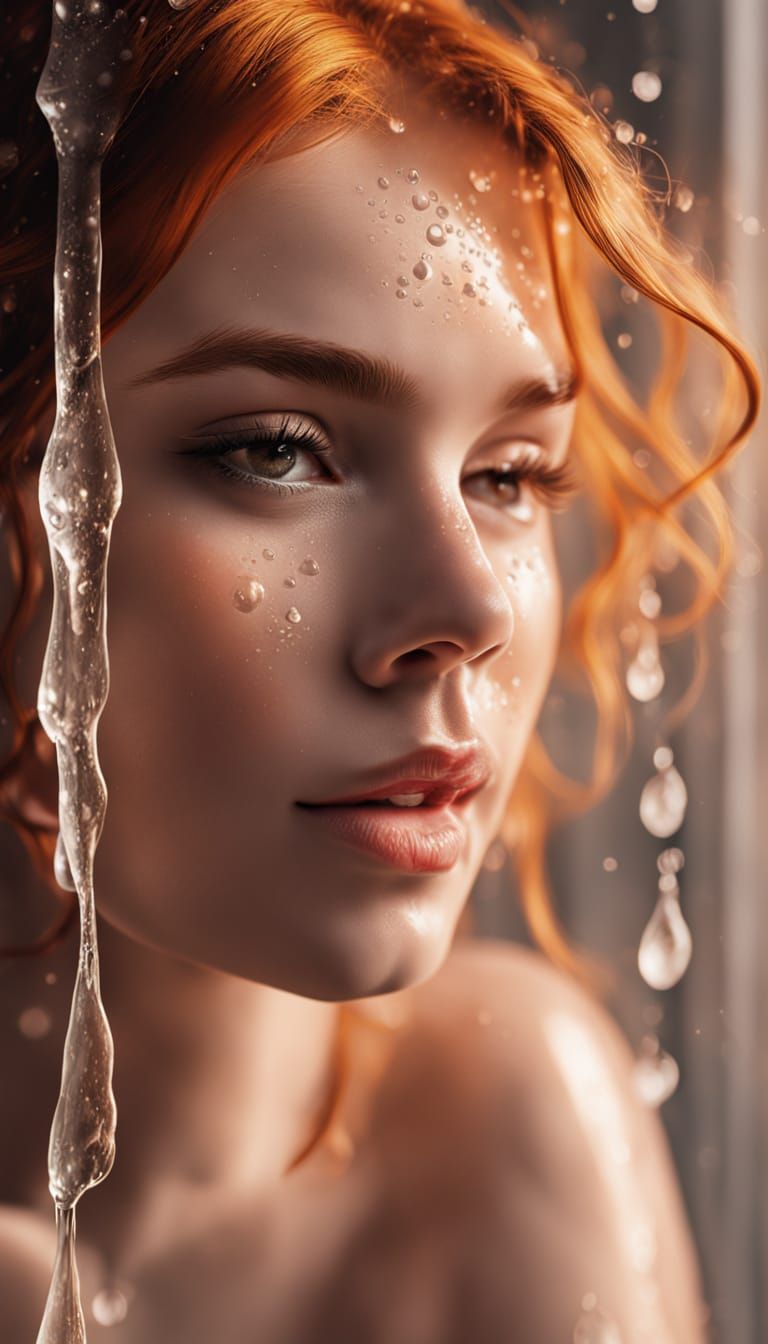 This image captures a serene moment of a plus-sized woman with red hair washing under a warm shower, surrounded by soft focus and shallow depth of field, with water droplets glistening on her skin like tiny diamonds.