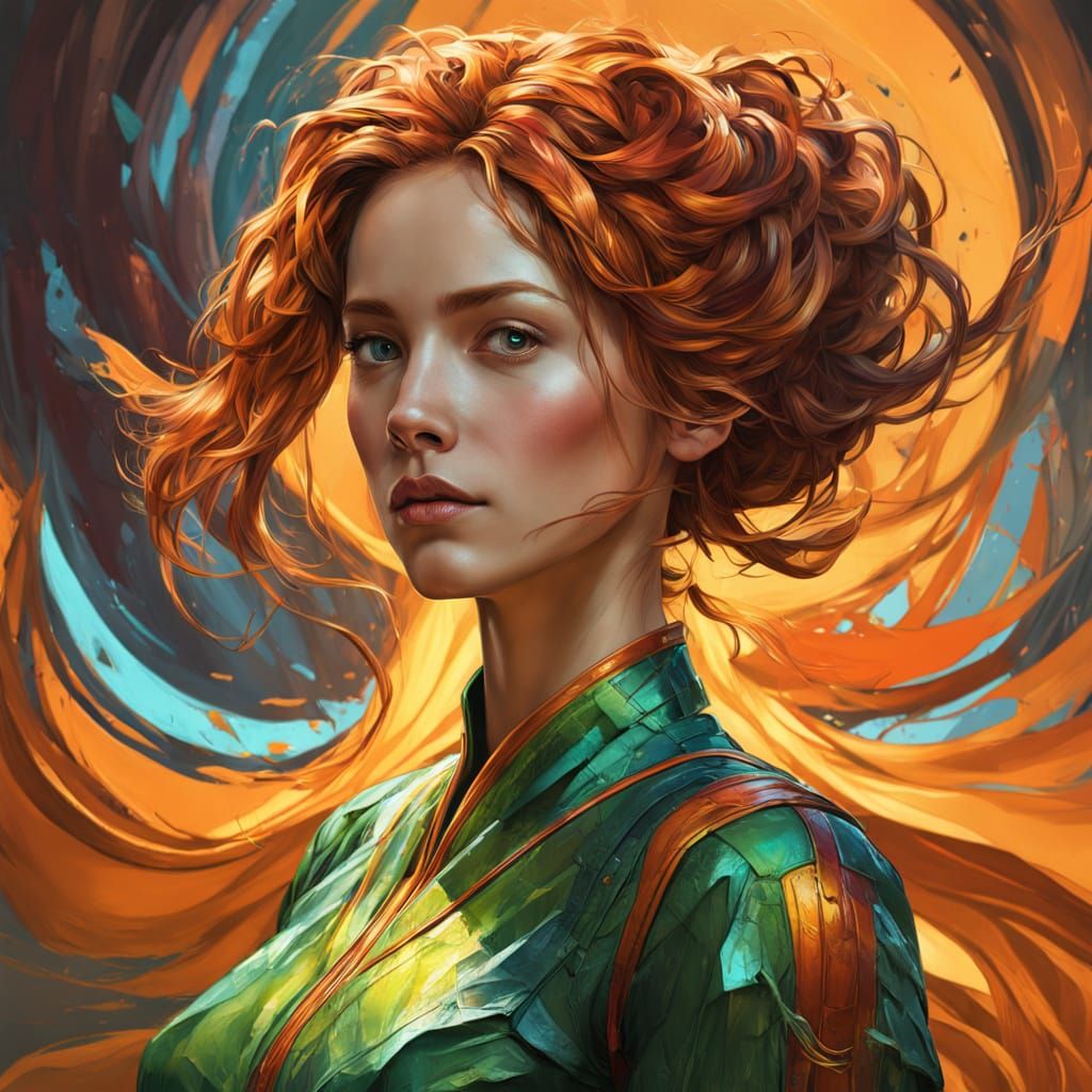 Abstract design of woman in green jumpsuit in daz3d style, orange and crimson colors, edgy portraiture, strong facial expression, shot with Nikon d750, folded plane, sharp focus