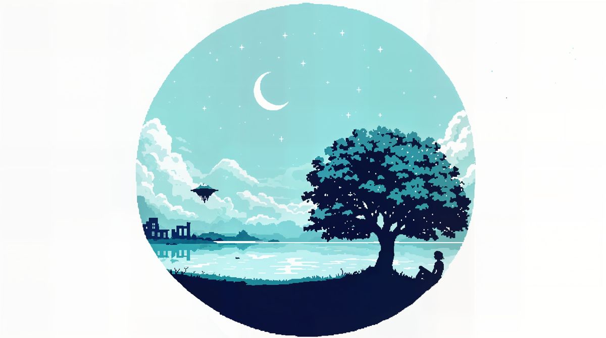 This image shows a serene and dreamlike pixel art landscape set under a tranquil night sky, featuring a pastel teal sky, a body of water, and a silhouetted woman in a peaceful atmosphere
