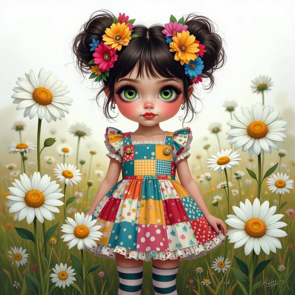 A captivating image of a girl with flowers in her hair standing in a field. This digital artwork showcases hyperrealism with vibrant colors and intricate details, set against a soft, dreamy background.