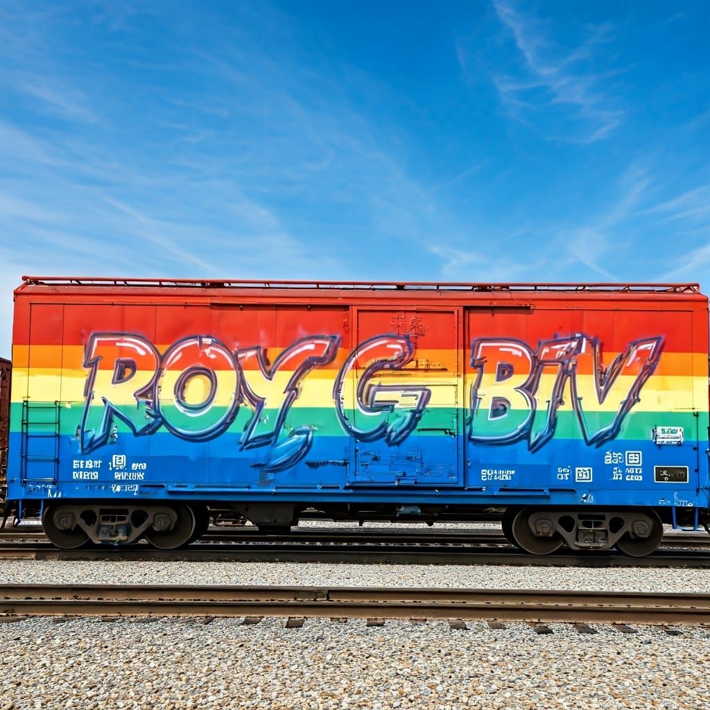 This image features colorful rainbow-painted railroad boxcars covered in graffiti. The graffiti uses bold geometric lettering in an urban style.