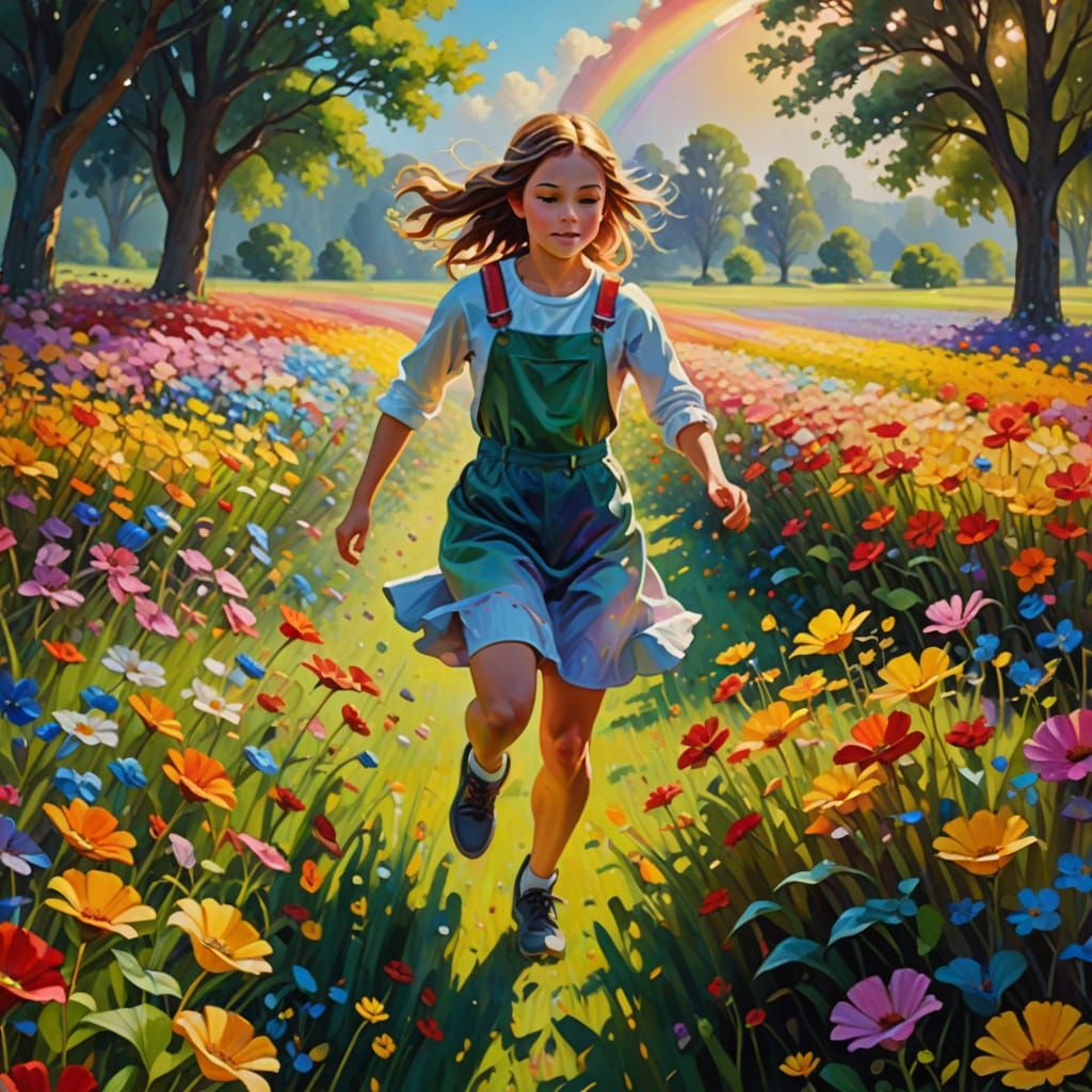 A vibrant oil painting depicts a girl running through a field of rainbow flowers. The impressionistic artwork uses soft brushstrokes and a pastel color scheme to create a serene and colorful scene.