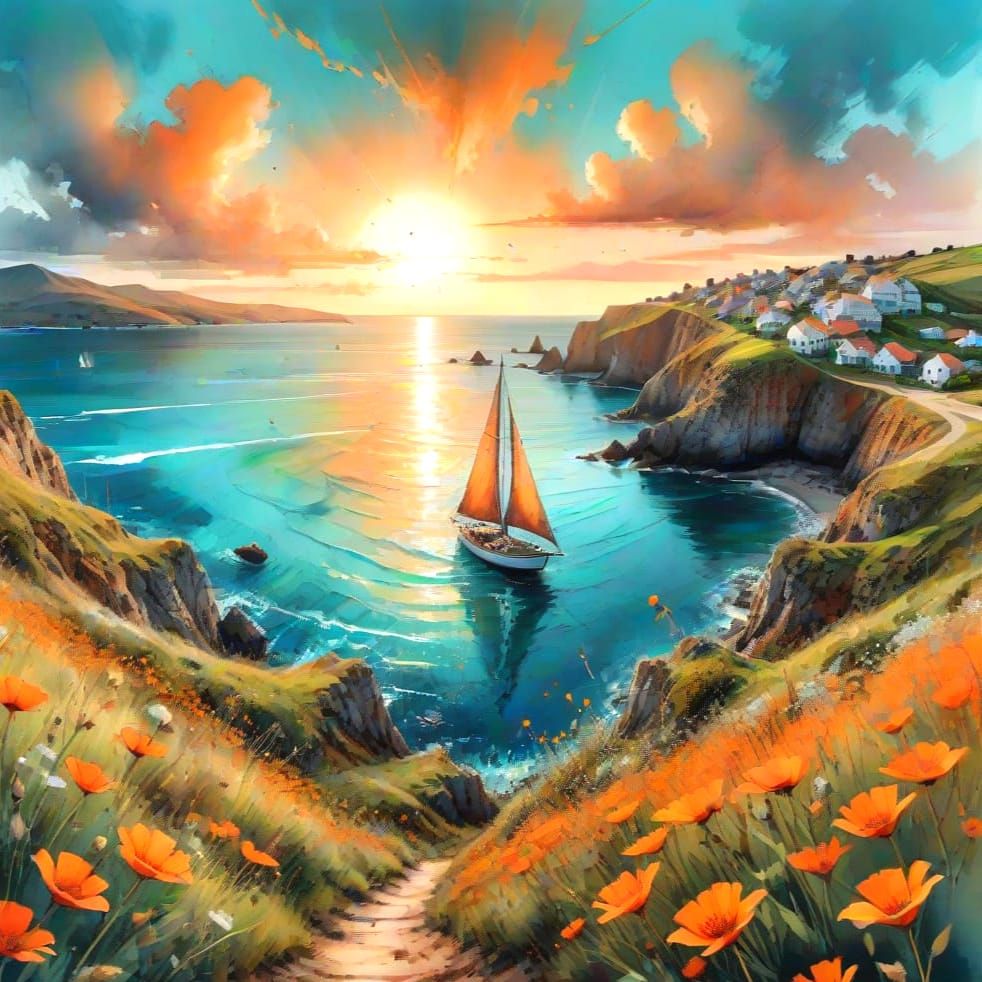 A vibrant watercolor painting of a coastal town nestled in wildflower-covered hills. A lone sailboat drifts on the turquoise sea under a warm sunset, with long shadows enhancing the intricate details.
