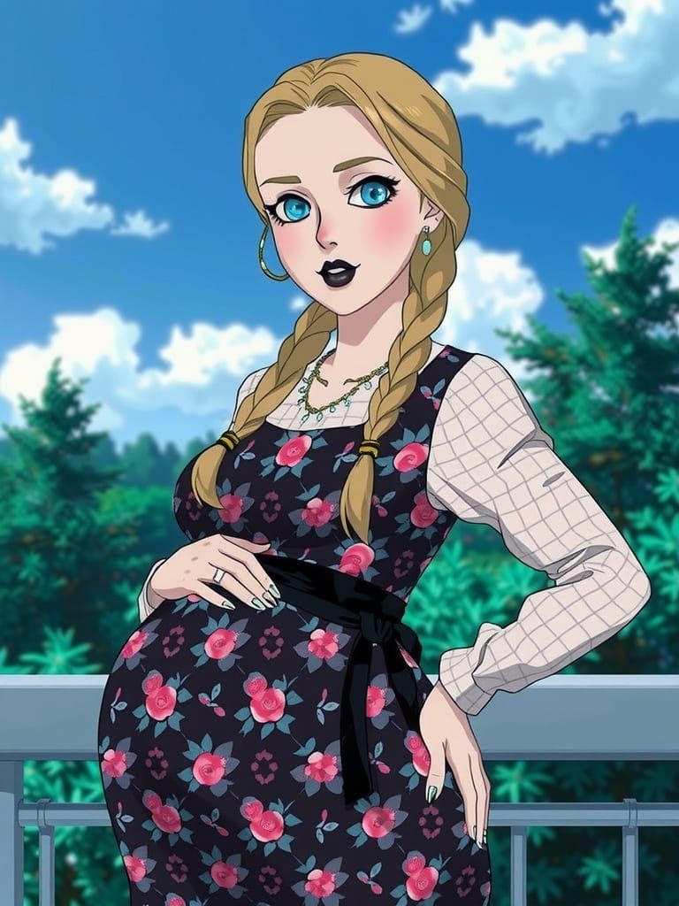 A Pregnant Woman with Braided Blond Hair, Blue Eyes, Black Eyeshadow and Black Lipstick, wearing a Black Floral Maternity Dress with White Flannel Sleeves and Collar.