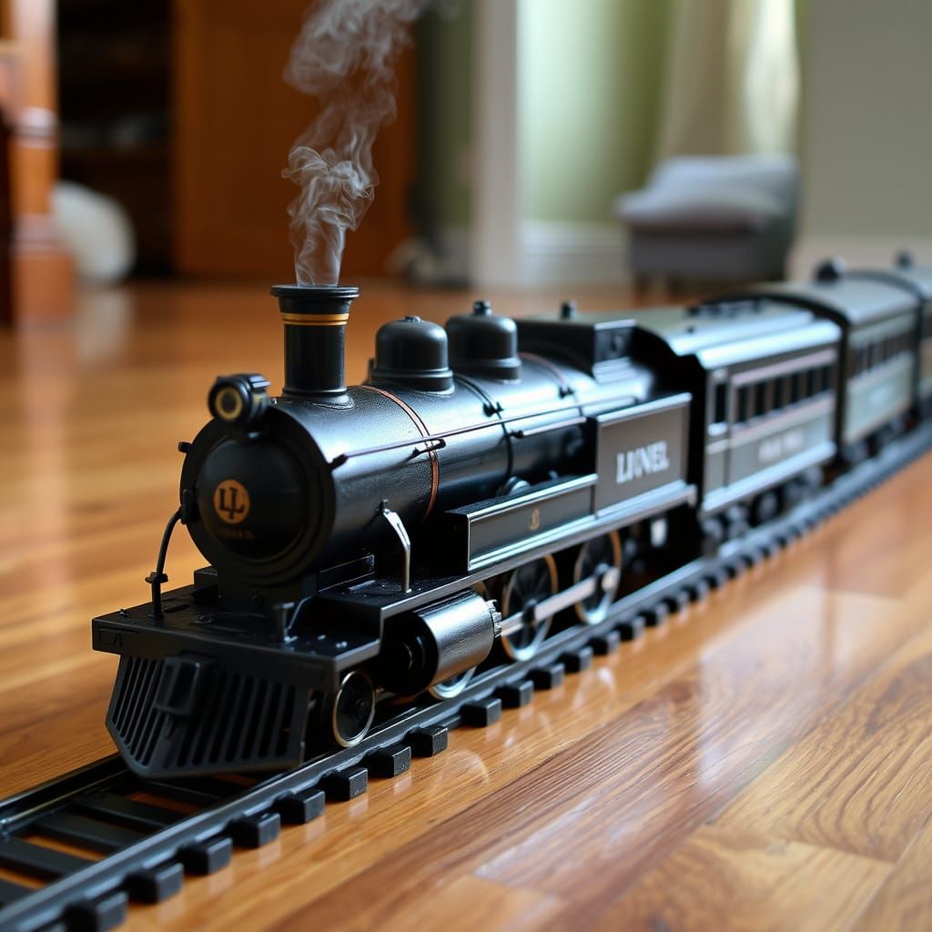 A nostalgic image of a classic Lionel train set in a cozy home setting, with a hint of smoke from the engine and intricate metal tracks.