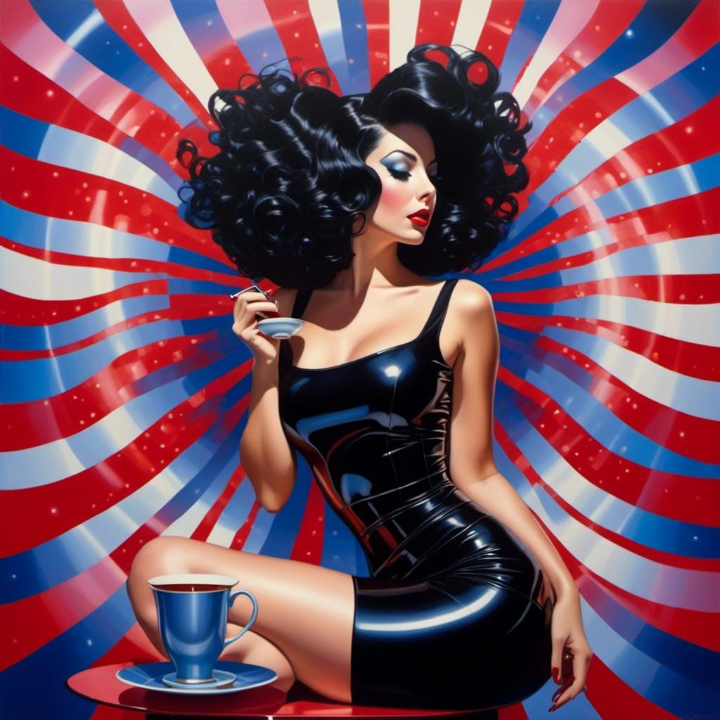A woman in a glossy black latex dress sits on a terrace, drinking tea against a radial gradient background. The artwork is reminiscent of watercolor painting.