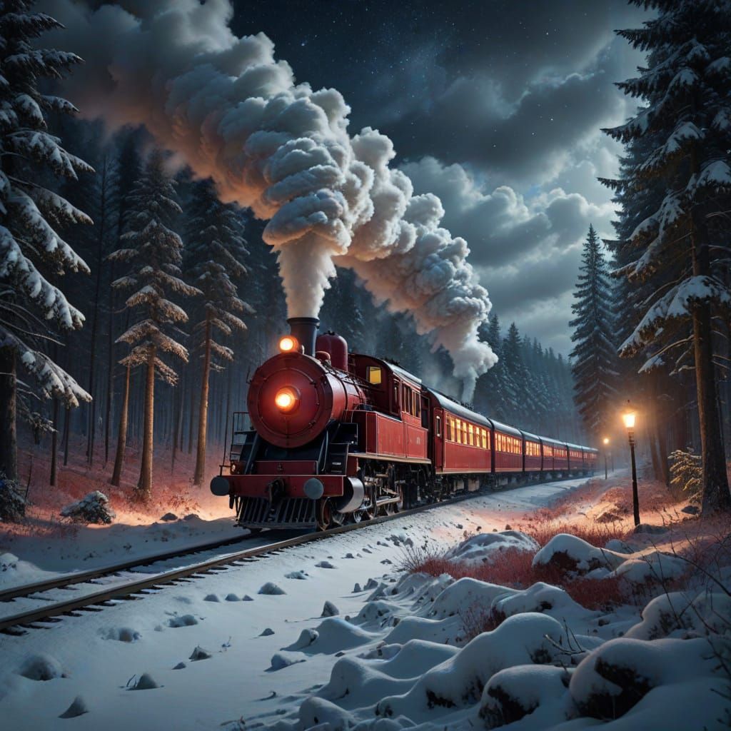 A cinematic digital art piece capturing a vintage steam train with crimson carriages traversing a snow-covered forest at night. Moody lighting highlights billowing steam and warm window glows.