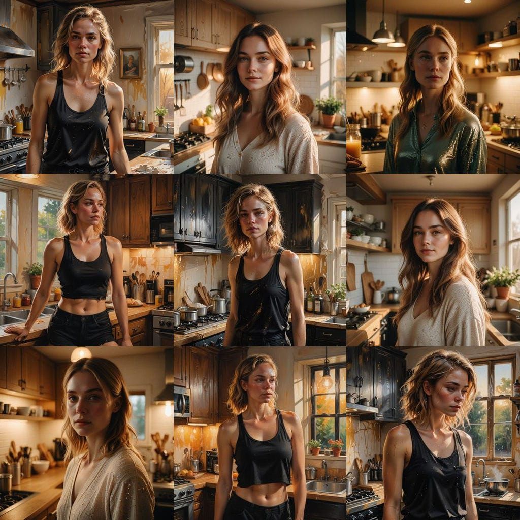 This image shows a woman with black hair in a kitchen. Soft golden light illuminates her figure as she leans against the counter, a playful expression on her face.