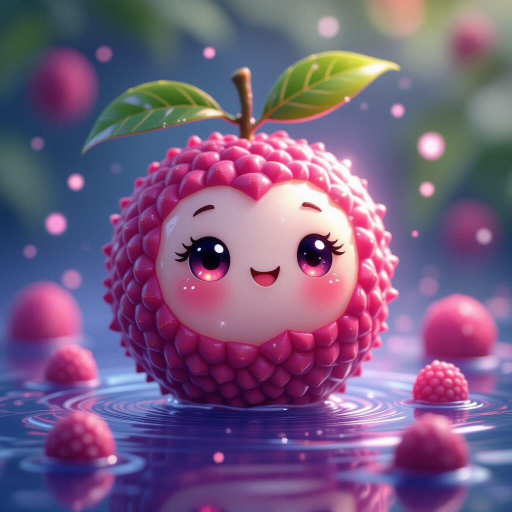 This image features a glittery, sparkly lychee with a cute face, presented as a detailed matte painting. It blends fantasy concept art with anime aesthetics, showcasing intricate details and deep colors.