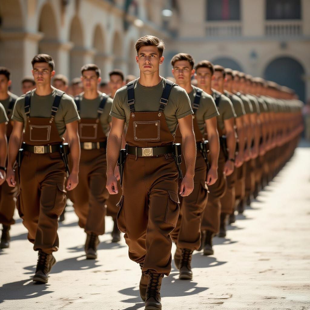 A cinematic film still showcases a highly disciplined army of young men in parade dress. They wear military t-shirts and brown overalls, exuding an epic and dramatic presence.