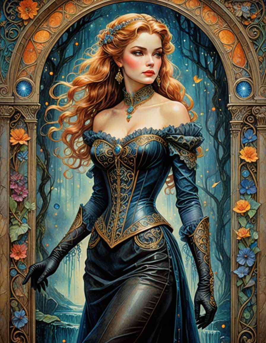 A vintage-style image of Ann-Margret in a tightly laced corset and leather boots. The artwork evokes a historical beauty with art nouveau elements and dramatic lighting.