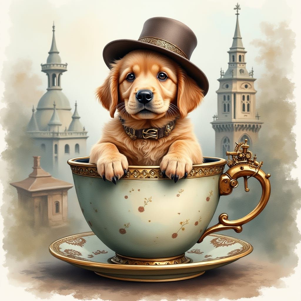 This image shows a steampunk-styled golden retriever puppy wearing a fancy hat, sitting inside an ornate teacup. The artwork is reminiscent of a watercolor painting with soft brush strokes, muted tones and pastel colors.