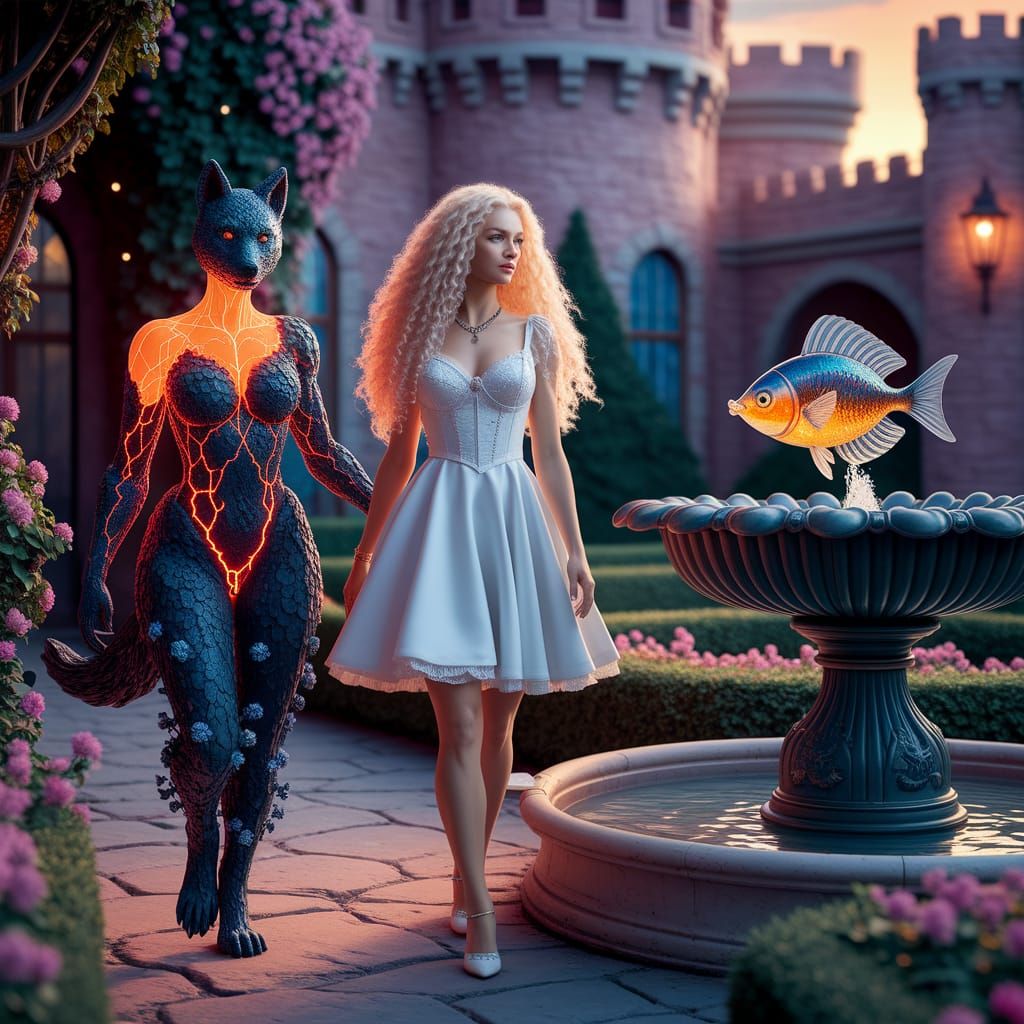 This image shows a blonde woman in a castle garden, accompanied by a deer made of flowers. A lava wolf stands nearby, while a glass fish swims in a fountain, all bathed in warm light.