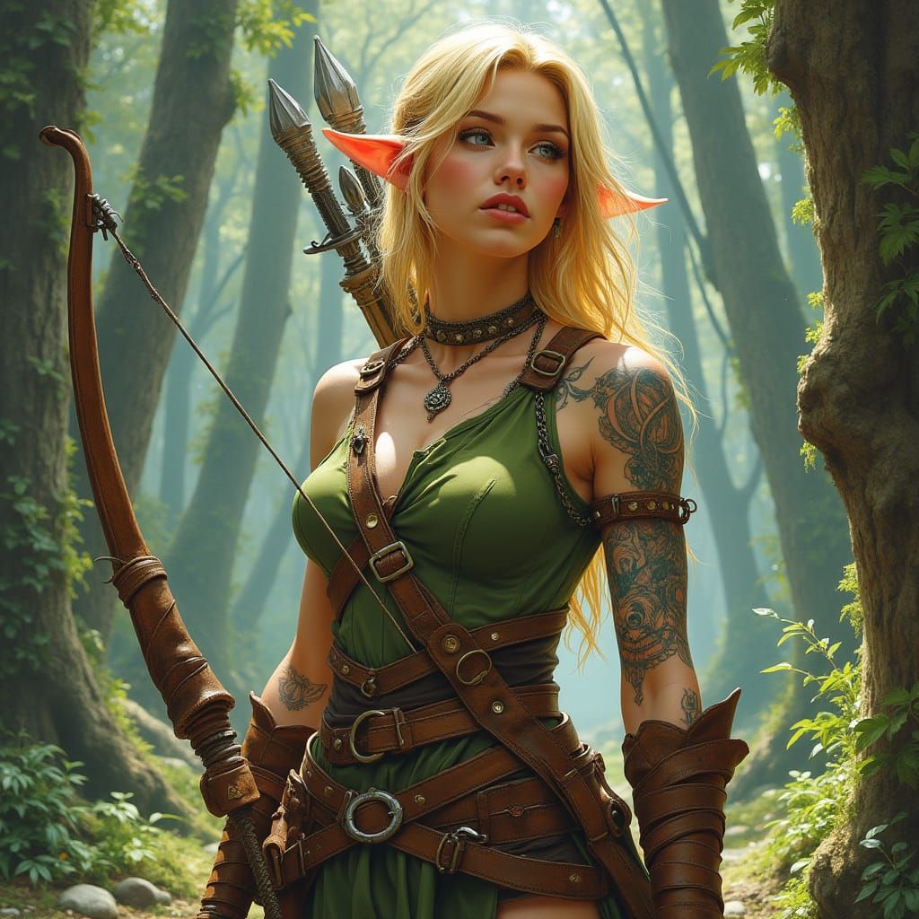 This image shows a blonde elven ranger in a mystical forest setting. She is armored in leather, carries a bow, and features intricate tattoos, rendered with vibrant colors in a fantasy art style.