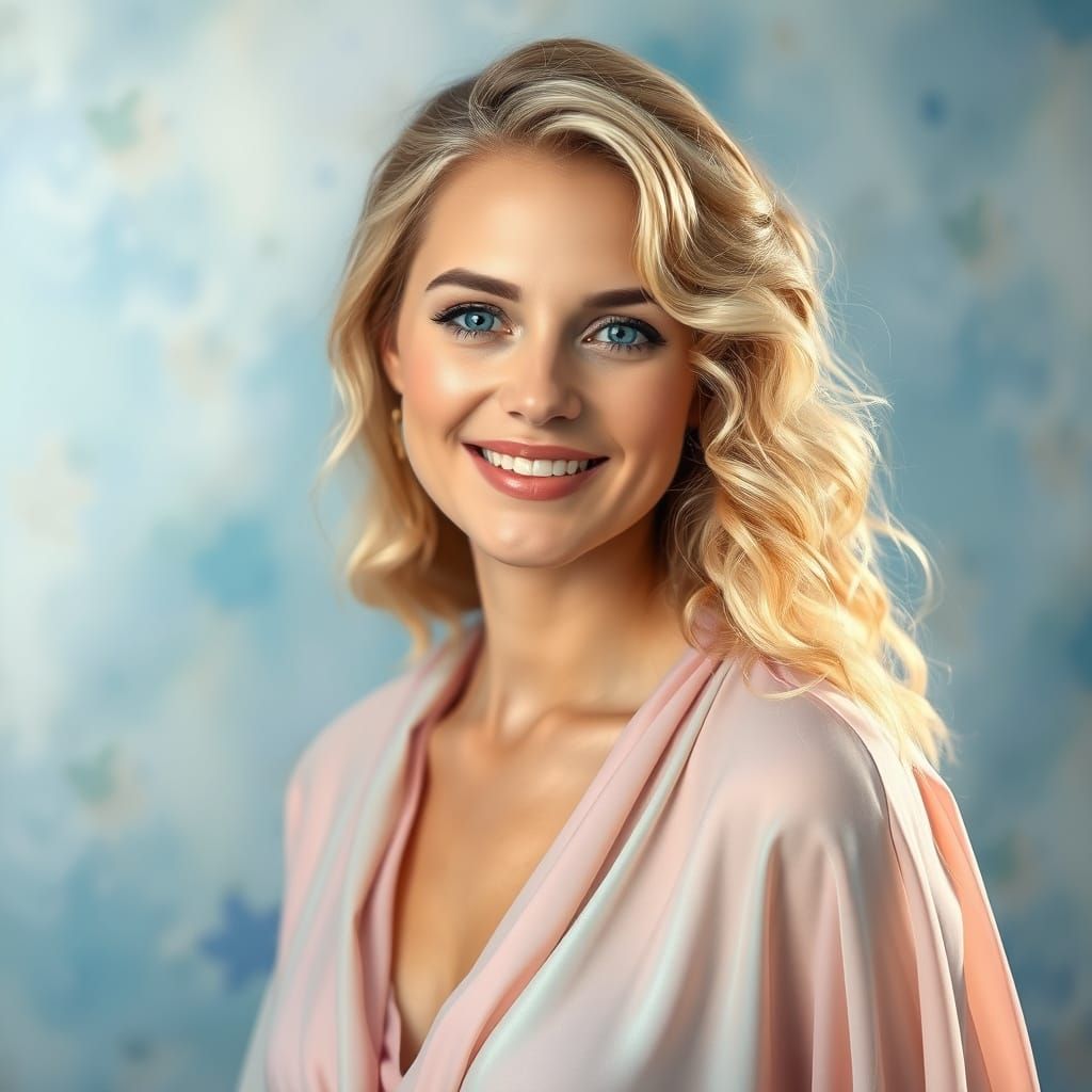 This image depicts a serene European woman with blonde, wavy hair and a radiant smile, wearing a lightweight, flowing gown in pastel hues reminiscent of Monet's impressionist paintings and Beardsley's whimsical illustrations, with delicate folds and drapes evoking mousseline and silk, in a dreamy, enchan...