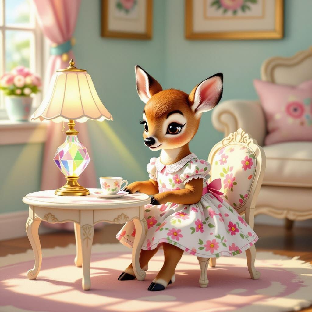 A sweet image of a baby deer wearing a dress, seated at a table with a lamp. The artwork is reminiscent of classic children's illustrations with vibrant colors.