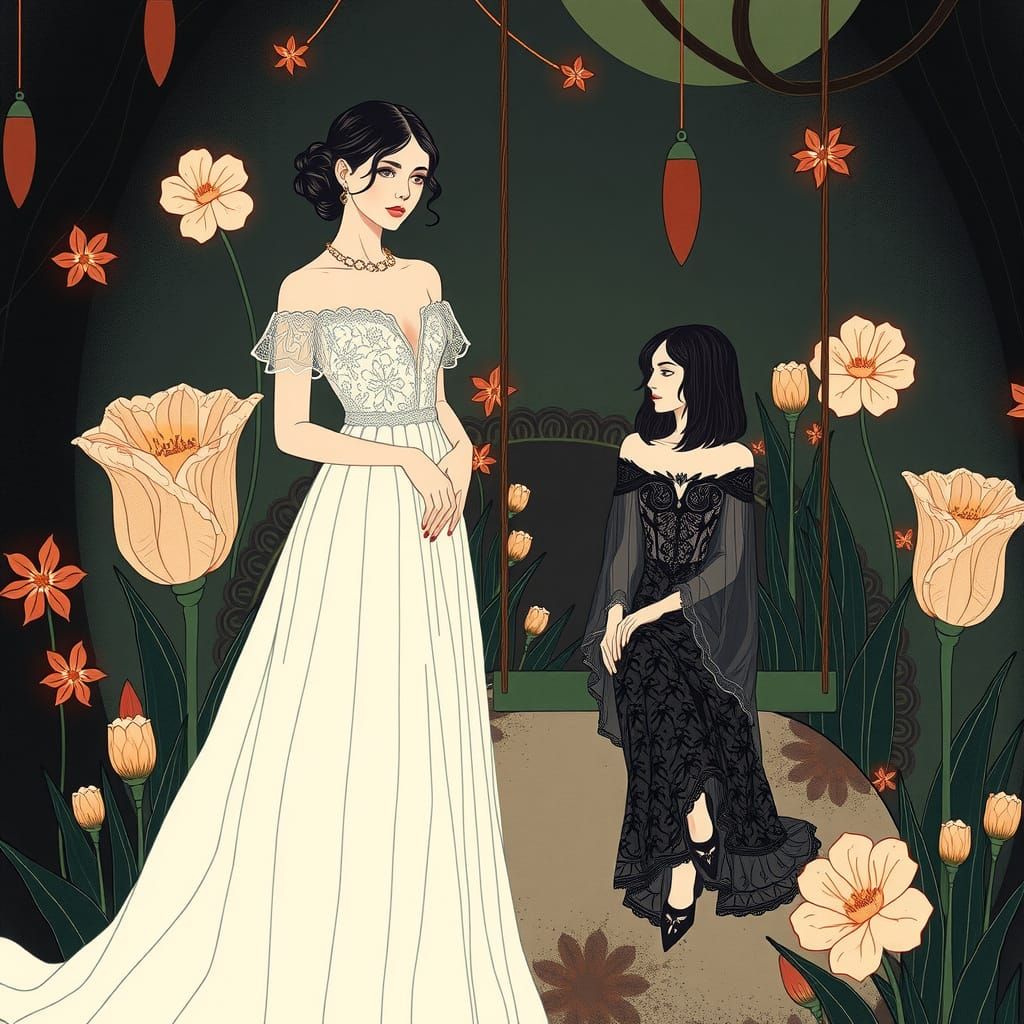 A captivating image of two women in a moonlit garden, one in white and the other in black lace. The art nouveau-inspired piece is reminiscent of line drawings with vibrant floral elements.