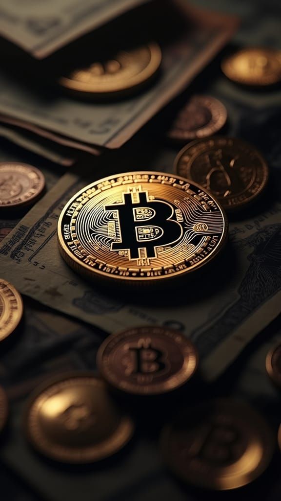 This image shows a close-up of a heap of cash. Gleaming coins and sharp banknotes are rendered with bold lighting and subtle textures, in a hyperrealistic digital art style.