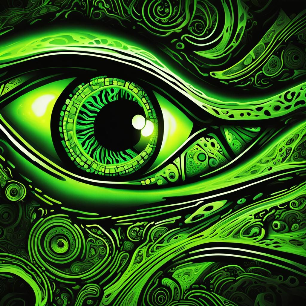 A mesmerizing close-up of an all-seeing eye surrounded by glowing neon green and black abstract patterns. This high-contrast image creates an intense, psychedelic effect with intricate details.
