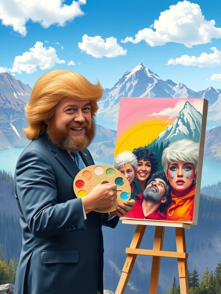 This image shows a satirical portrait of Donald Trump, sporting Bob Ross's iconic afro, painting a vibrant, expressionist landscape of liberals crying. The serene natural background, complete with mountains, lakes, and fluffy clouds, adds a touch of whimsy to this humorous artwork.