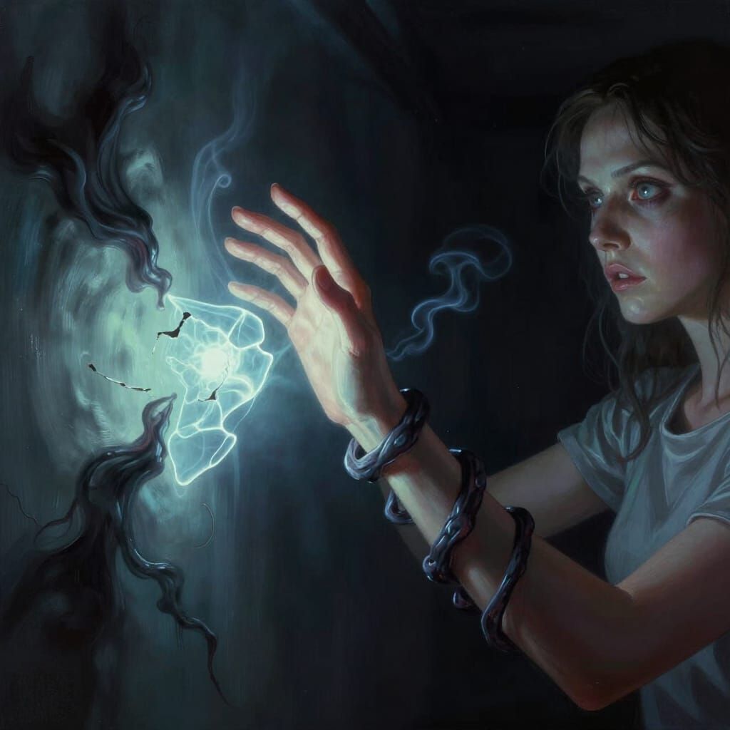 This image depicts a woman's arm reaching for a glowing, fractured object, with dark tendrils wrapping her wrist. The scene features dramatic lighting and a sense of cosmic dread, rendered in a digital matte painting style.
