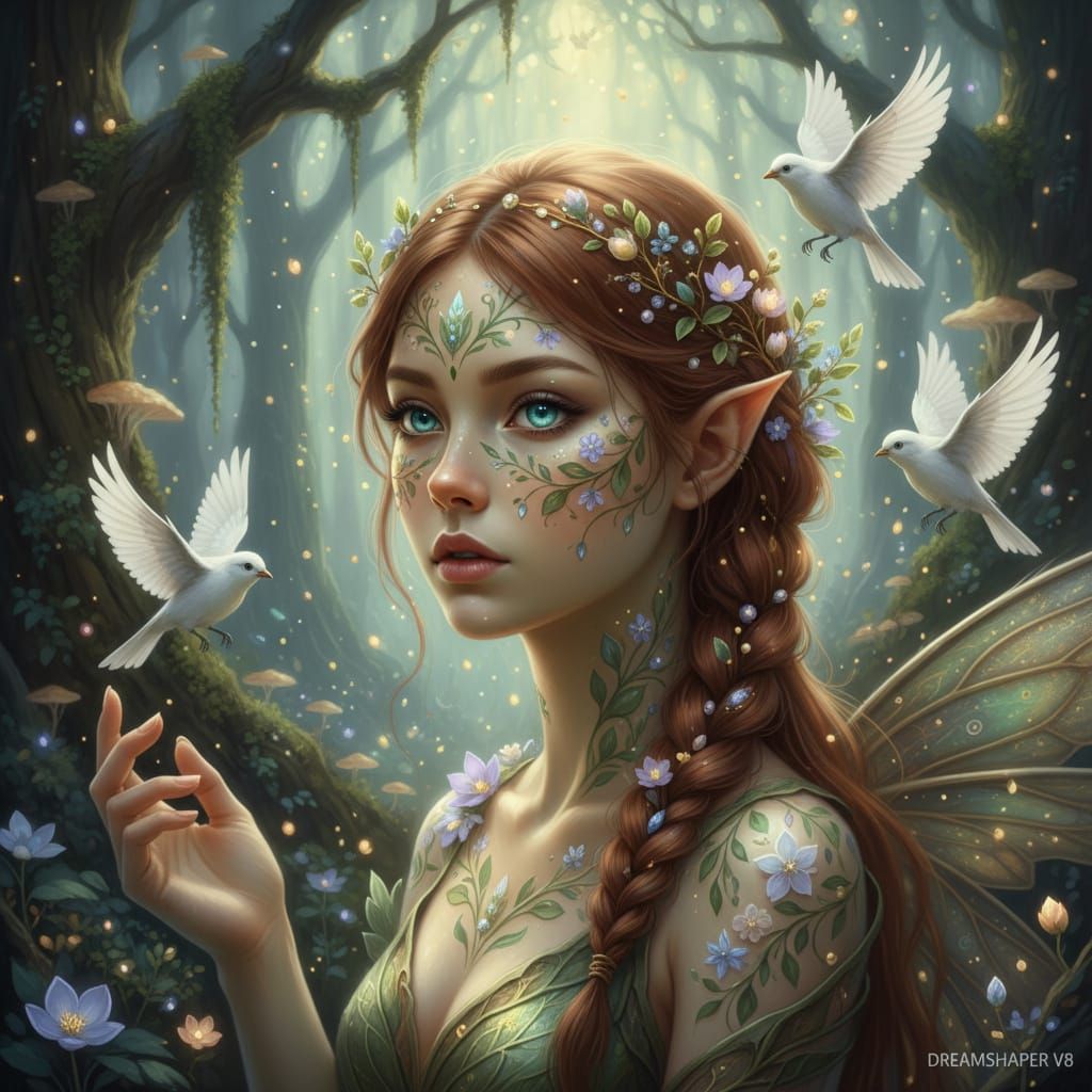 This image shows a detailed portrait of a forest fairy with delicate floral tattoos and glowing eyes, surrounded by birds and botanical adornments in an enchanted woodland setting with soft, volumetric lighting.