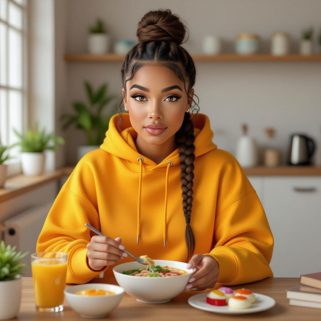 This ultra-realistic image captures ASMR influencer Talia Tate enjoying a mukbang session. Dynamic lighting highlights her vibrant outfit, food, and expressive features in photorealistic detail.