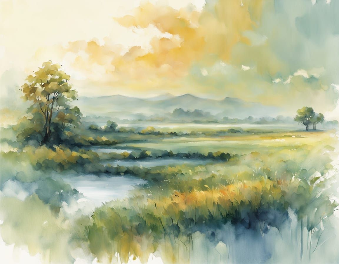 This idyllic landscape is captured in a soft, impressionist style, with warm golden light and vibrant blues and greens evoking a sense of peaceful serenity.