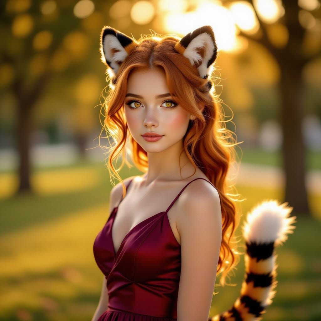 This hyperrealistic image shows a high school girl with tiger ears, fluffy tail, orange hair, and eyes, wearing a wine-colored dress in a sunlit park at golden hour. Photographed with cinematic lighting and shallow depth of field.