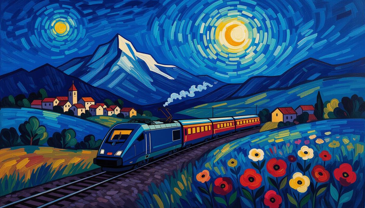 This image shows a French village landscape from an aerial view at night. A train passes in the rain, while a vibrant sunset lights up the snow-capped mountains and flowers in an impressionist style.