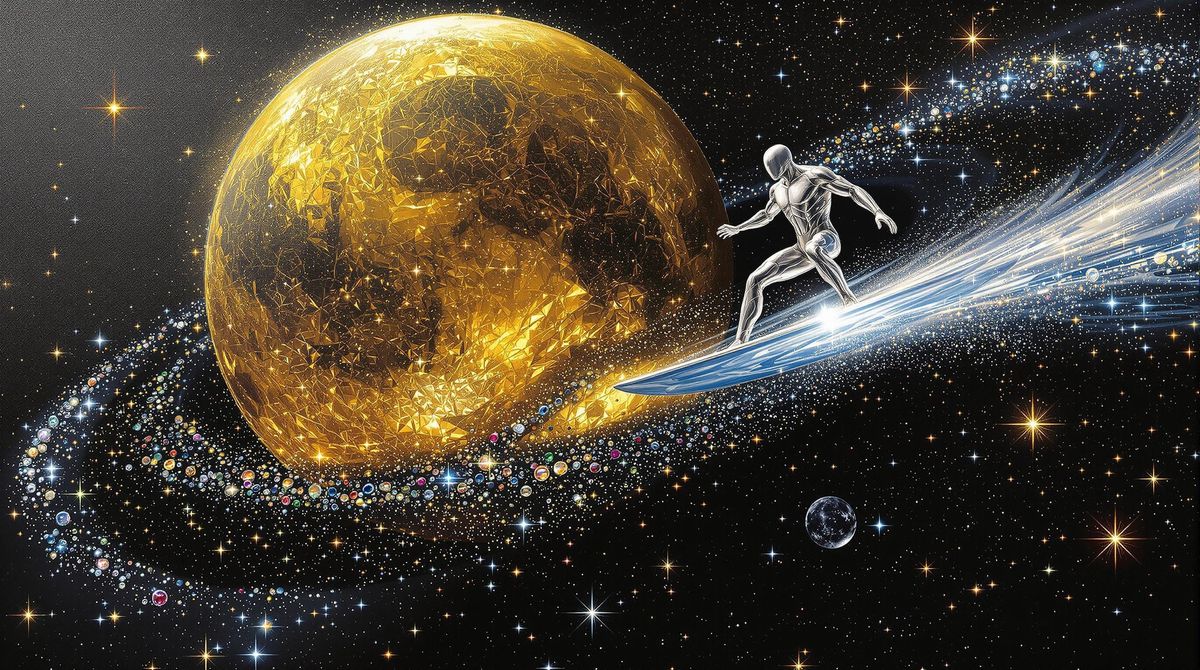 This image shows a stunning, surreal depiction of the Silver Surfer sailing through space, set against a starry, black sky with a gold and black moon in the background. The artwork blends dramatic chiaroscuro, melting forms, and cosmic landscapes in a mesmerizing, mixed-media piece.