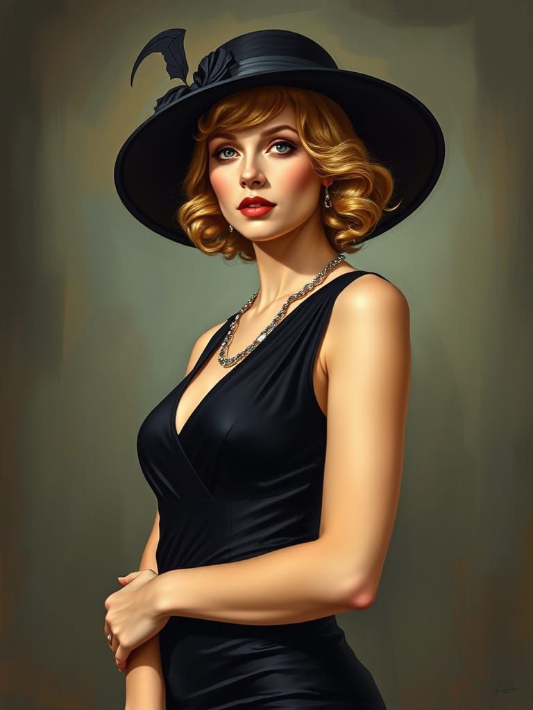 A full-body portrait of a blonde baroness in the art nouveau style. The woman sports a 1920s hairstyle, a black hat, and a tight black minidress, reminiscent of Alphonse Mucha.