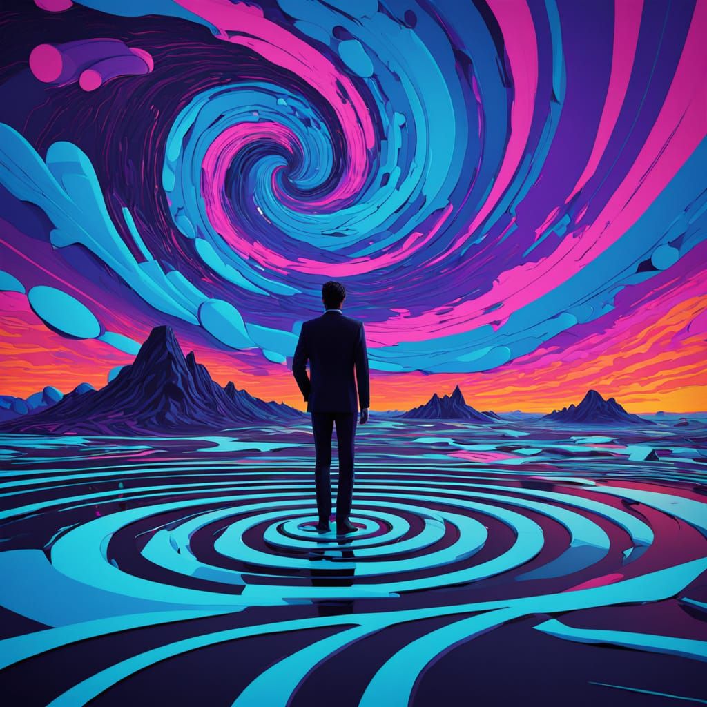A striking picture of a lone figure silhouetted against a colorful vortex on a desolate plain. This digital artwork features dreamlike, melting elements with cosmic horror themes, rendered in deep blues and purples.