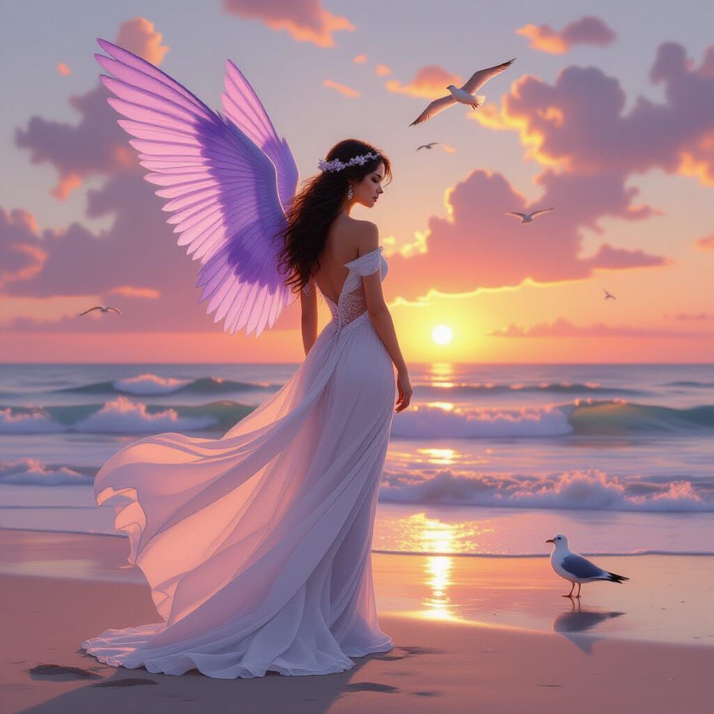 This image shows a woman with violet wings silhouetted against a sunset on a serene beach. The artwork blends romanticism and ethereal beauty with intricate details, reminiscent of art nouveau.