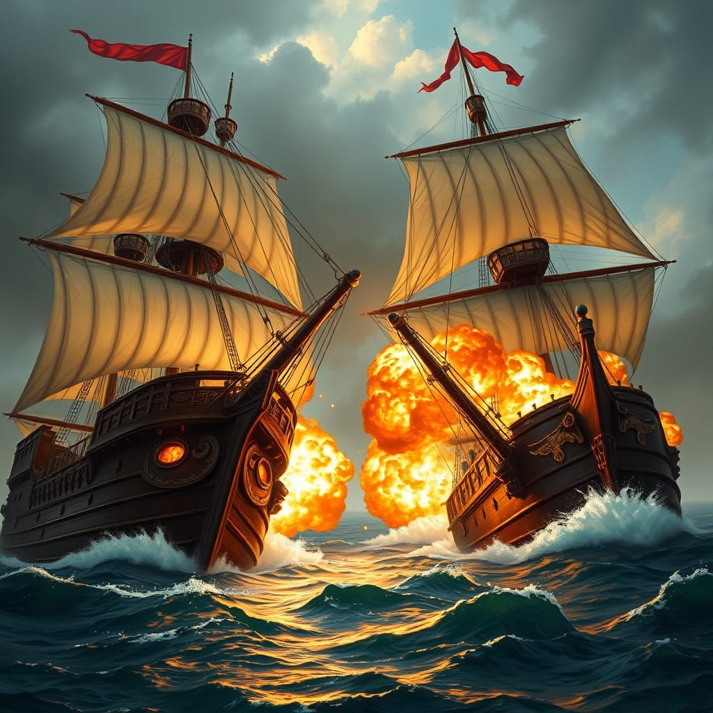 A dramatic image shows two galleons engaged in a fierce naval battle. Cannon fire causes explosions as the ships exchange broadsides in a dramatic seascape, with detailed textures and vibrant colors.