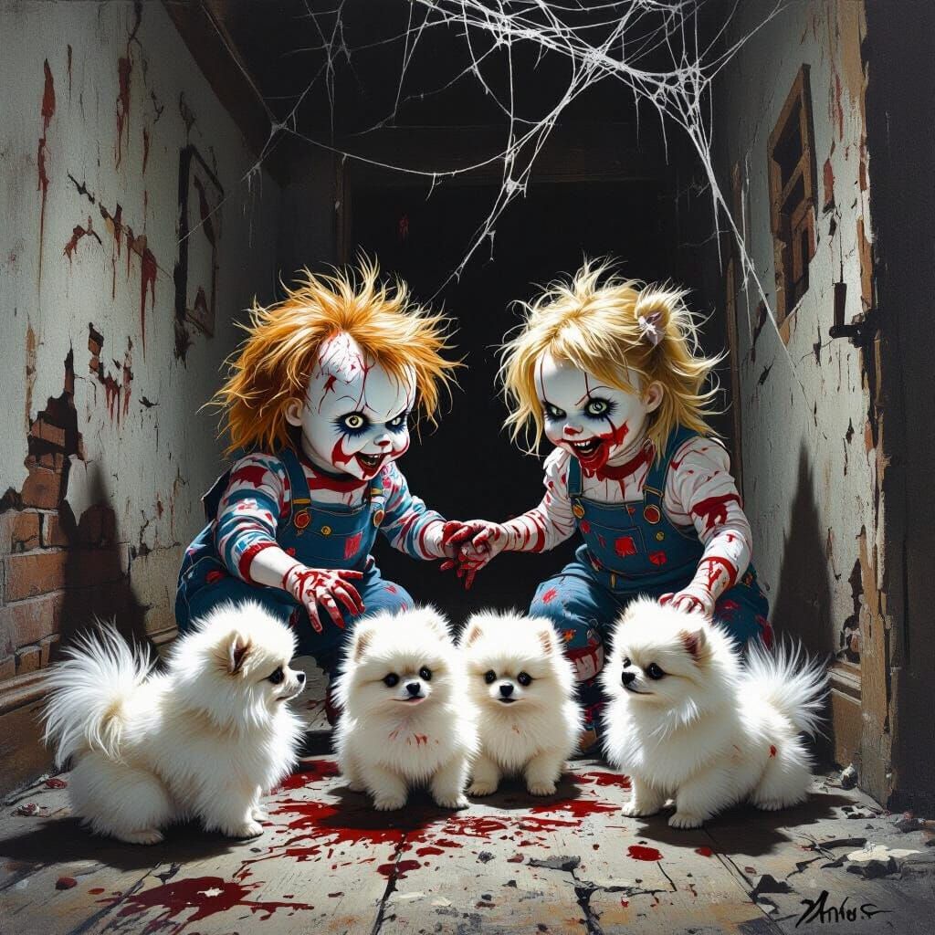 This image depicts Chucky and Tiffany covered in blood, playfully interacting with white Pomeranians in a spooky haunted house. Rendered in a gritty, expressionistic horror art style with high contrast lighting.