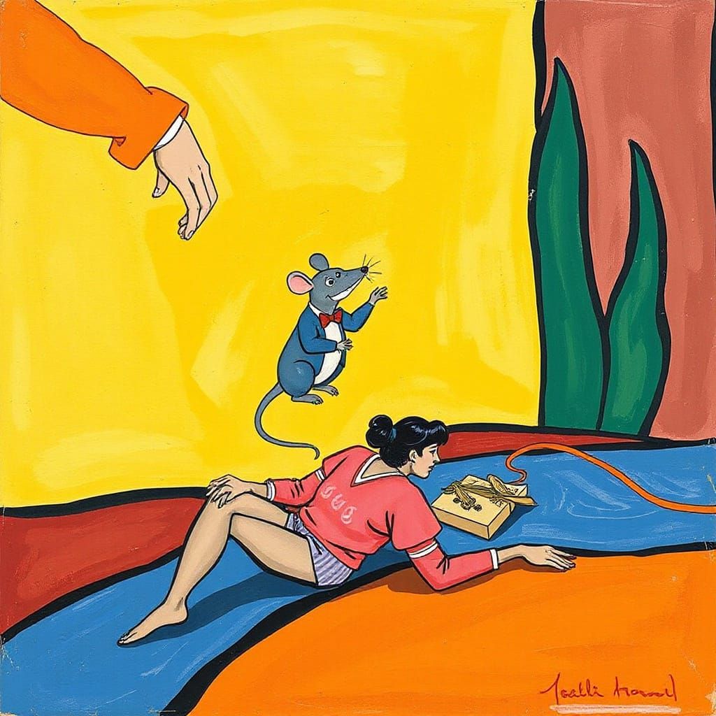 This image shows a cartoon mouse character in a bizarre, surreal setting. The artwork employs bold colors and fractured perspectives, rendered as a vibrant and expressive painting.